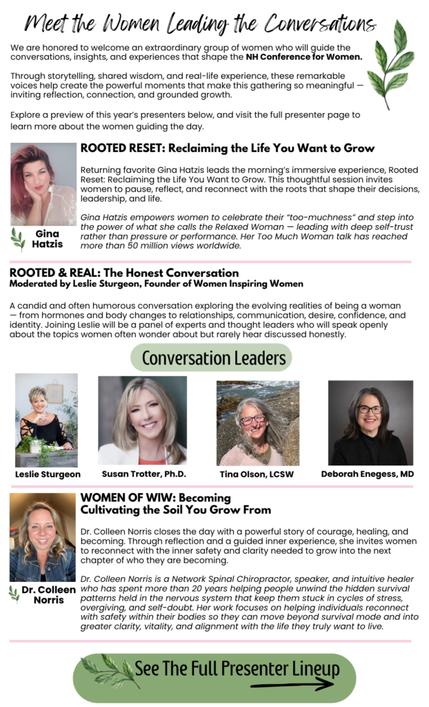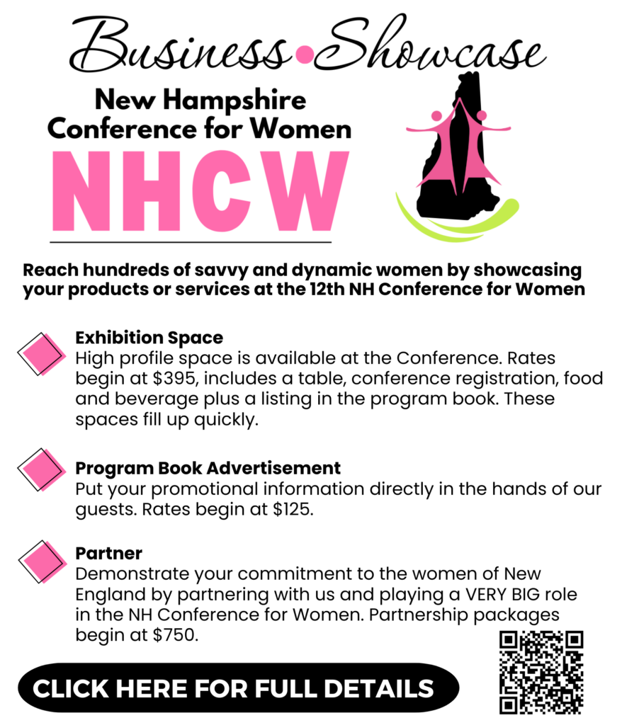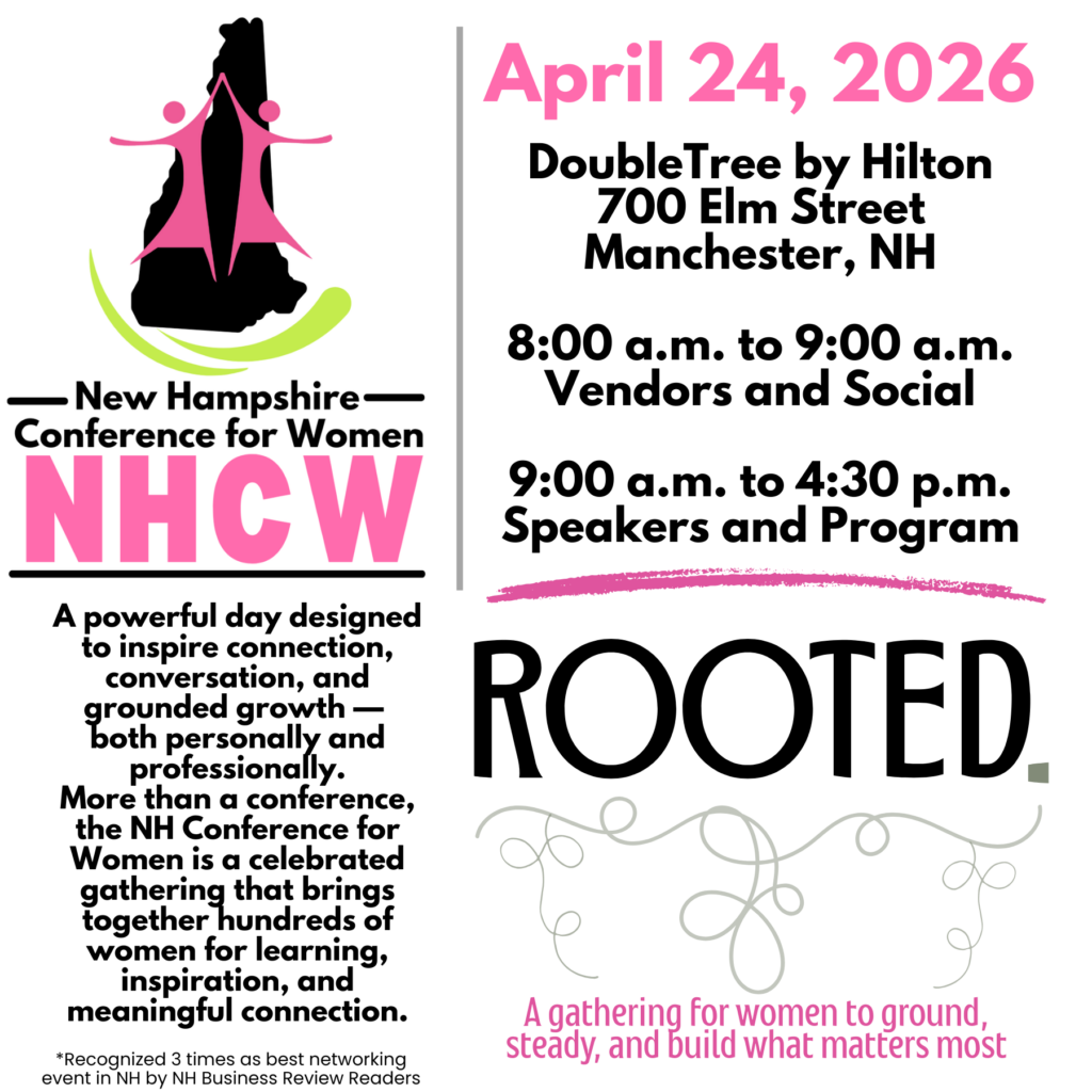 Throughout the day, you’ll experience inspiring speakers, meaningful conversations, and opportunities to connect with women from across New Hampshire and beyond. The conference also features our Business Showcase, where local businesses share resources, services, and ideas designed to support women in both their professional and personal lives.